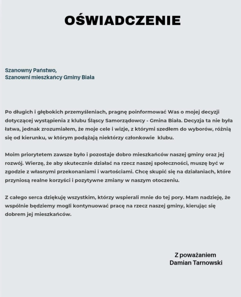 Dzisiaj wieczorem w mediach społecznościowych Damian Tarnowski ogłosił, że podjął decyzję o wystąpieniu z klubu radnych, który zrzeszał Śląskich Samorządowców w radzie gminy. Swoją decyzję tłumaczył różnicami w postrzeganiu wizji i celów, z jakimi szedł do wyborów, a postępowaniem niektórych członków klubu Śląskich Samorządowców