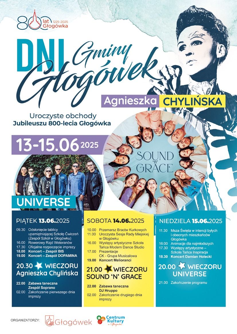 Już w piątek 13 czerwca rozpoczną się obchody Dni Głogówka. Miasto to w tym roku obchodzi jubileusz 800-lecia. 3 dniowa impreza będzie obfitowała w wiele wydarzeń. Jeśli chodzi o stronę koncertową, to w piątek gwiazdą wieczoru będzie Agnieszka Chylińska, w sobotę zespół Sound n’ Grace, zaś w niedzielę Universe. Plakat wydarzenia z rozpiską wszystkich wydarzeń umieszczamy poniżej.