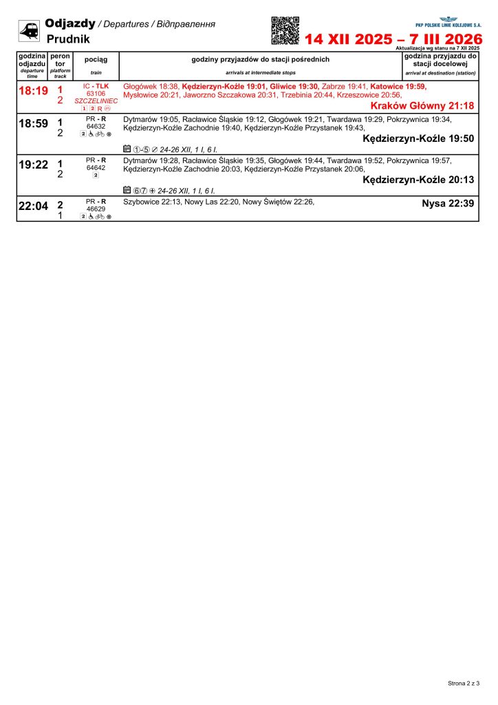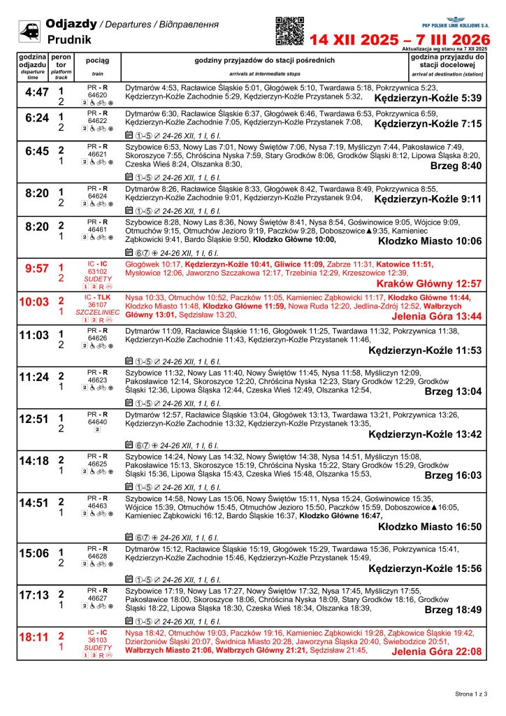 W niedzielę 14 grudnia wszedł w życie nowy rozkład jazdy pociągów. Dla mieszkańców Prudnika i Głogówka ważne jest to, że dalej przez magistrale podsudecką będą dalej przejeżdżały dwie pary pociągów Intercity relacji Jelenia Góra-Kraków. Już standardowo możemy stwierdzić, że ilość połączeń pozostaje dalej zdecydowanie niesatysfakcjonująca. Jedynie na linii nr 137 (Nysa-Kędzierzyn-Koźle) możemy zaobserwować jedno nowe połączenie w dni robocze, jednak tylko w jednym kierunku.