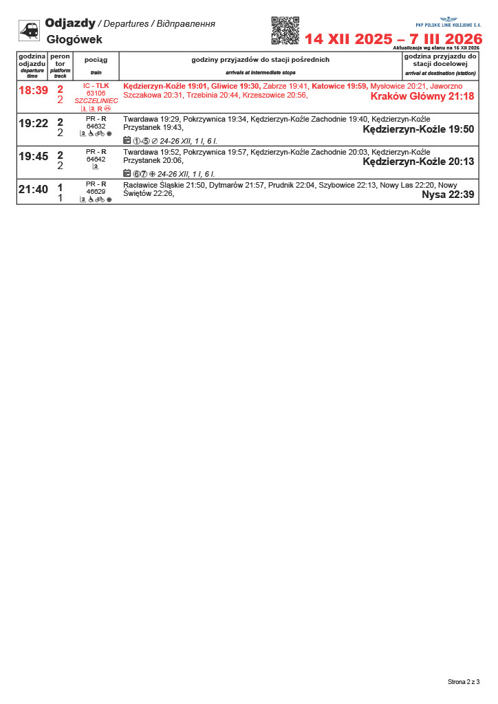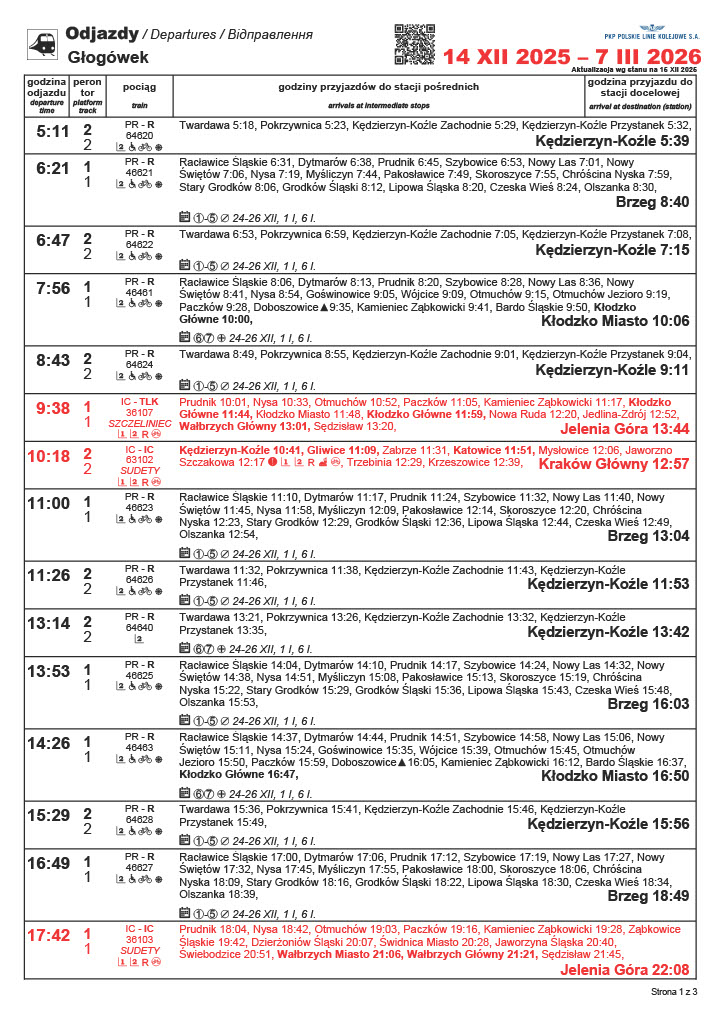 W niedzielę 14 grudnia wszedł w życie nowy rozkład jazdy pociągów. Dla mieszkańców Prudnika i Głogówka ważne jest to, że dalej przez magistrale podsudecką będą dalej przejeżdżały dwie pary pociągów Intercity relacji Jelenia Góra-Kraków. Już standardowo możemy stwierdzić, że ilość połączeń pozostaje dalej zdecydowanie niesatysfakcjonująca. Jedynie na linii nr 137 (Nysa-Kędzierzyn-Koźle) możemy zaobserwować jedno nowe połączenie w dni robocze, jednak tylko w jednym kierunku. Przed wybraniem się w podróż sprawdźmy godziny odjazdów – w przypadku niektórych połączeń różnią się od poprzednich.