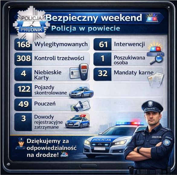 Skontrolowano 122 pojazdy, zastosowano 49 pouczeń i nałożono 32 mandaty karne. W 3 przypadkach zatrzymano dowody rejestracyjne, a 1 sprawa trafiła do sądu. Wszczęto również 4 procedury „Niebieska Karta”.